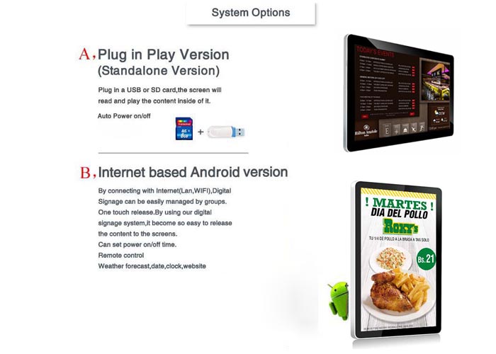 Notice : If you don't like our CMS software, you can also install your own Apk in our machine, which means that you can integrate other digital signage player or system software in display. |
