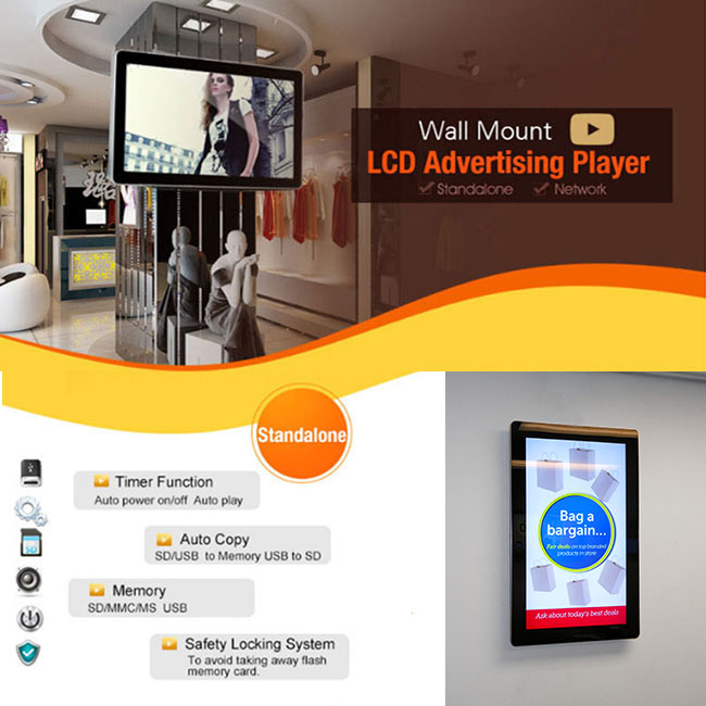 wall mounted lcd digital signage 42 inch is a LCD Display with an integral media player, Media files are stored and played back from USB or SD card. When you boot the machine up, it would auto read those files (video/photo)from memory card simple one.